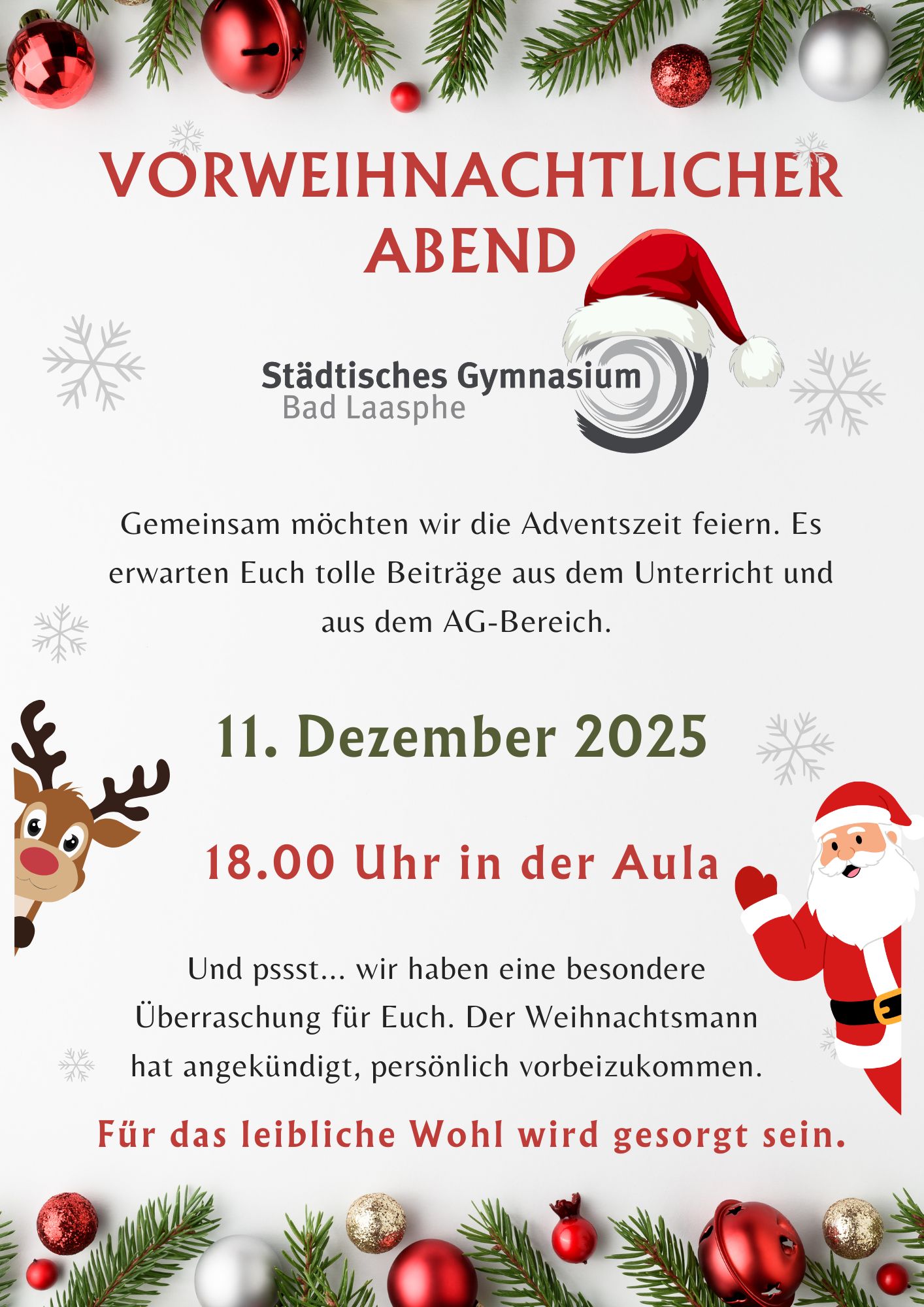 Aber auch andere Fachbereiche brachten sich aktiv in den Abend mit ein. Ergänzend zum musikalischen Programm gab es zwei Lesungen weihnachtlicher Geschichten, die von den Finalistinnen des Vorlesewettbewerbs vorgetragen wurden. Im Rahmen des Kunst-Unterrichts wurden in den Wochen vor der Veranstaltung zahlreiche Tischdekorationen gebastelt, die das Ambiente in der festlich geschmückten Aula der Schule abrundeten. Im Religionsunterricht wurden während der Behandlung des Themas „Schöpfung erhalten“ Feueranzünder aus recycelten Materialien hergestellt, die mitgenommen werden konnten. Die Schülerinnen und Schüler der Jahrgangsstufe EF versorgten die Anwesenden zudem mit frischen Waffeln und Brezeln sowie leckerem Kinderpunsch, so dass auch für das leibliche Wohl gesorgt war. Ein weiteres Highlight war der Besuch des Weihnachtsmannes, der den anwesenden Kindern natürlich auch eine kleine Überraschung mitgebracht hatte.